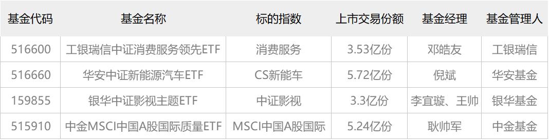 今日,4只ETF齐上市,分别为,工银瑞信中证消费服务领先ETF、华安中证新能源汽车ETF、银华中证影视主题ETF和中金MSCI中国A股国际