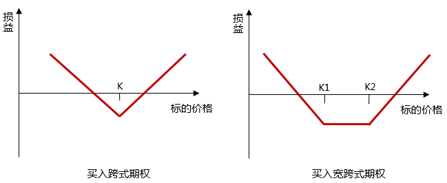 构成方式:跨式期权是由两个性质相同的看涨和看跌期权构成;而宽跨式期权中看涨期权的执行价格(K2)大于看跌期权执行价格(K1)。
