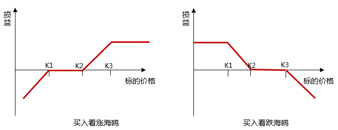 构成方式:海鸥期权由三个到期日相同的香草期权组成,其中看涨海鸥由两个看涨期权和一个看跌期权构成;两个看跌期权和一个看涨期权可组成看跌海鸥。