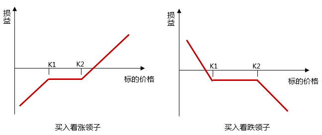 构成方式:看涨领子可通过买入较高执行价格(K2)的看涨期权的同时卖出到期日相同,执行价格(K1)较低的看跌期权构成;若转换买卖方向,买入执行价格为K1的看跌期权并卖出执行价格为K2的看涨期权就可以构建出看跌领子。