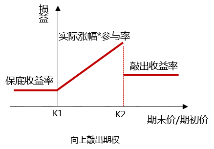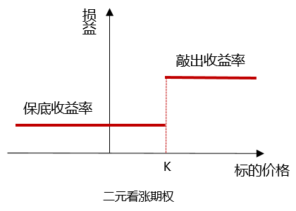二元期权也是障碍期权的一种,又被称为固定收益期权。其收益情况只有两种,以二元看涨期权为例,当涨幅大于敲出价格时可获取敲出收益率,否则只能获取保底收益率。