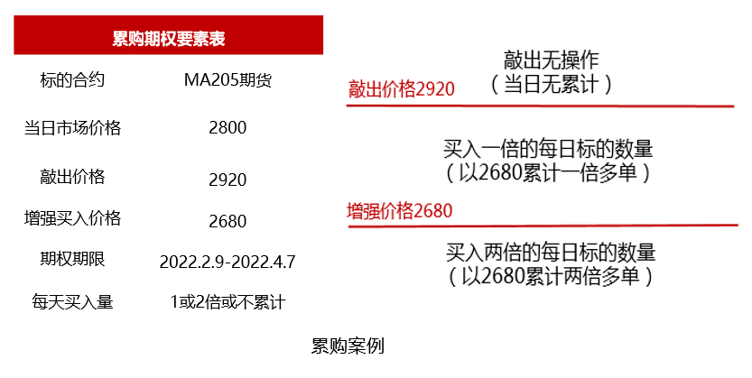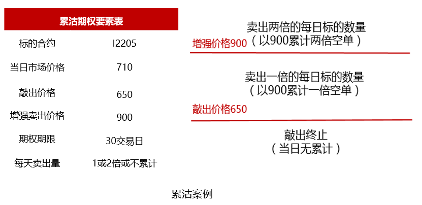 累计期权,是一种结构化期权,包括累购期权以及累沽期权。该种期权可以满足很多具有实际生产业务的实体企业,客户有预估实际每天产量,或者每日生产所需原材料。原材料端,每日自动以期权合约规定价格或者期货盘面价格买入;生产端,每日自动以期权合约规定价格或者期货盘面价格卖出。