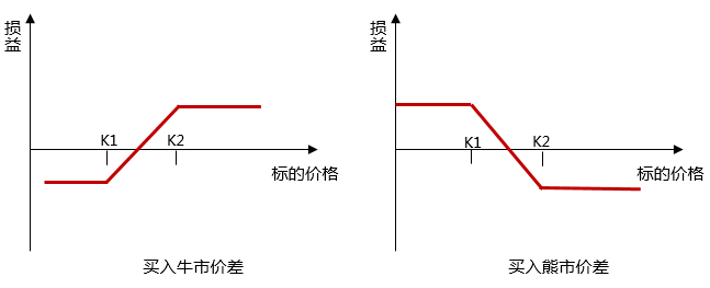 构成方式:牛市价差与熊市价差期权均可以用看涨或看跌期权构造。其中牛市价差是买低卖高,也就是买入到期日相同,执行价格较低的看涨(看跌)期权的同时卖出较高执行价格的看涨(看跌)期权;而熊市价差则是卖低买高。