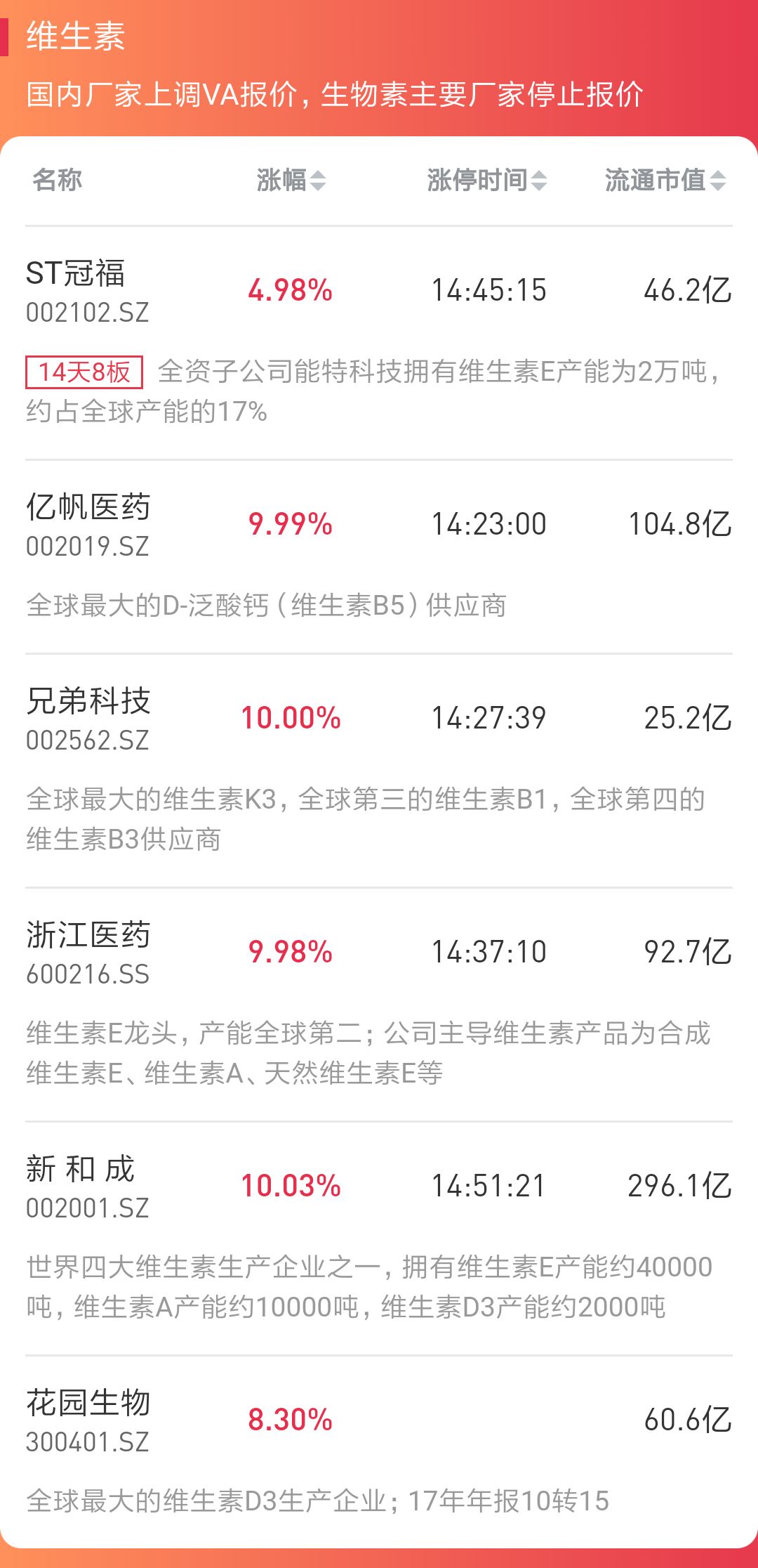 由于维生素品种行业竞争格局比较相似,泛酸钙等单一小品种短期大幅上涨,容易扩散至其他小品种,进而向维生素A、维生素E等大品种扩散,引发行业涨价潮。就持续性而言,这个板块未来可能会以波段行情为主,连续大涨的难度比较大。